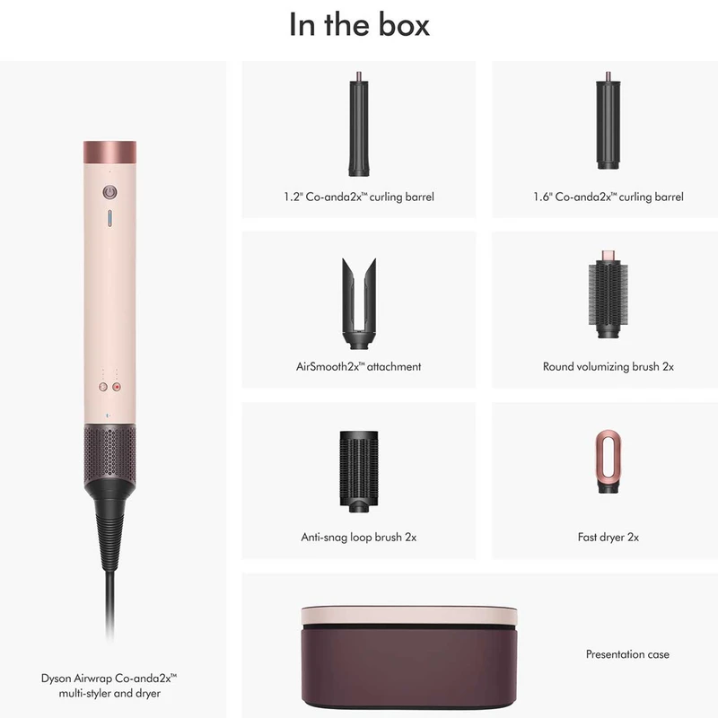 سایر مشخصات اقلام همراه: -سری خشک کن سریع Fast Dryer 2X -سری صاف کننده Airsmooth 2X -سری فر کننده 40 mm Co-anda 2X -سری فر کننده 30 mm Co-anda 2X -برس گرد حجم دهنده-برس ضدگره خوردگی و برس حرارتی -باکس محصوص نگهداری Dyson Presentation Case / مناسب برای انواع مو، شامل نازک، ضخیم و فر /عملکرد کامل برای حالت دهی، حجم دهی و صاف کردن